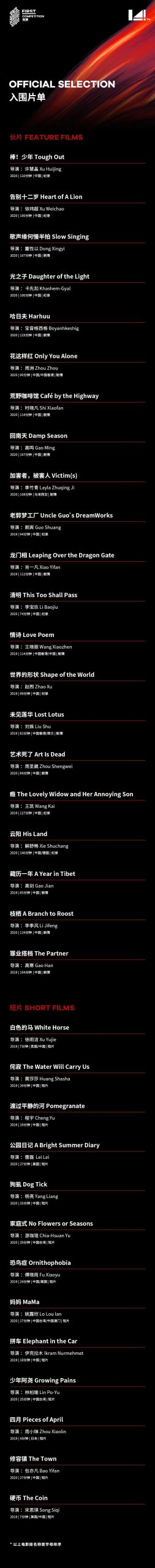 疫情对电影制作生产的冲击不可谓不明显。整个征片周期内,影片数量变化在起始的12、1、2月与上一年度同期保持相近趋势。然而,3月出现了转折,投片数显著减少,2月制作完成的剧情长片数量更是跌至谷底,说明疫情对拍摄中断、后期停摆等制作环节有着直接的影响。另一方面,大规模国际电影节的取消、推迟、线上化,以及全国院线的彻底停摆,打乱了影片进行电影节首映和院网发行的计划。往年FIRST短片单元中大量的学生作品,也因开学时间的推迟而无法如期完成。