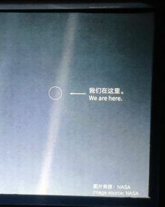 “再看看那个光点,它就在这里。那是我们的家园,我们的一切。你所爱的每一个人,你认识的每一个人,你听说过的每一个人,曾经有过的每一个人,都在它上面度过他们的一生。我们的悲喜相加,千百个自以为是的宗教、意识形态和经济学说,每一个猎人与强盗,每一个英雄与懦夫,每一个文明的缔造者与毁灭者,每一个国王与农夫,每一对青春爱侣,每一对母亲父亲,憧憬的孩童,发明家与探险家,每一个德行崇高的教师,每一个贪污腐败的政客,每一个“超级明星”,每一个“最高领袖”、人类历史上的每一个圣人与罪人,都住在这里……我们的装模作样,我们的自以为是,我们的错觉以为自己在宇宙里的位置有多优越,都被这个暗淡的光点所挑战。”